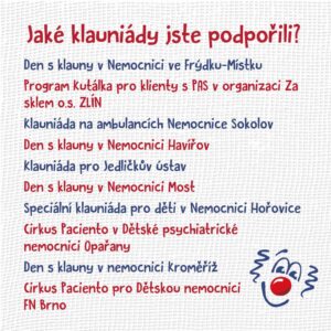 Deset různých oddělení dětské onkologie nebo hemato-onkologie v šesti nemocnicích po celé republice. Téměř 550 návštěv za minulý rok. Na těchto místech je nás třeba častěji než kde jinde. Naši klauni se stávají pravidelnými parťáky vážně nemocných pacientů, jsou jejich oporou v těžkých časech a tancem a zpěvem jim pomáhají přečkat dlouhé chvíle na lůžku.